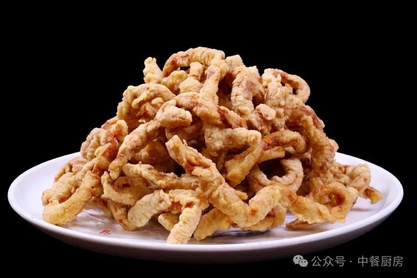 3、锅中油温升至五成热,下入肉条初炸定型,并用炒勺轻敲使其松散;捞出肉条;将油温升至八成热,复炸至金黄酥脆,捞出沥油装盘;最后撒适量花椒面增香即可