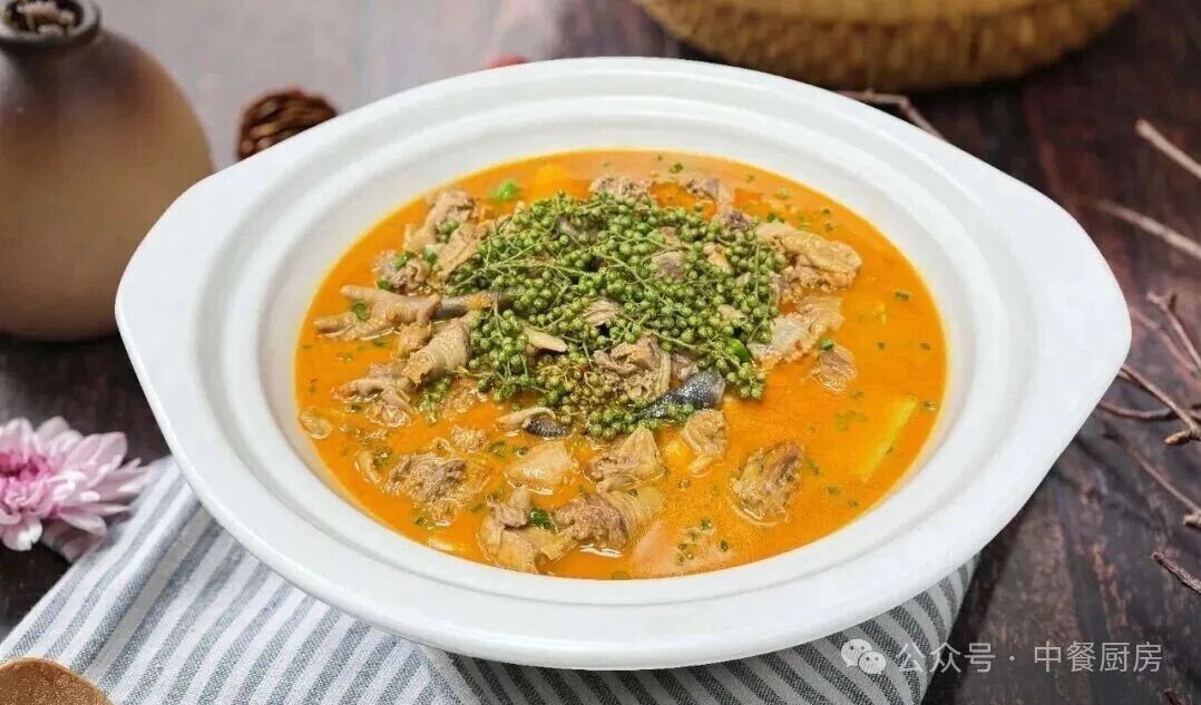 2.锅入菜籽油烧热,下姜片、蒜片爆香,放邱湾青花椒、干辣椒炒出香味,倒入鸡块炒至表面微黄,调入料酒、生抽、老抽,添清水没过食材,大火烧开后连汤带料倒入高压锅,上汽压15~18分钟,此时鸡肉软烂,开盖倒回铁锅,调入盐、白糖、鸡精,以大火将汤汁收浓,盛入砂锅,撒九叶青花椒,带葛粉一碟即可走菜。