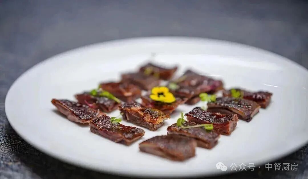 10.将切好的鸭脯整齐地摆放在盘子中,然后走菜时,在鸭脯上淋上5克之前制作并晾凉的黑椒汁。