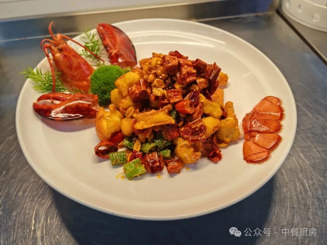 4.把油倒出来,下入青红椒圈,放入事先炸好的龙虾肉块,放入少许味精、盐焗鸡粉、椒盐粉后,翻炒均匀,加入黄飞鸿香脆椒再次翻炒,放入少许辣椒油,炒均匀后,倒出装盘点辍后即可!