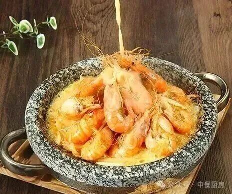 3. 石锅入烤箱300度烤15分钟拿出刷油,铺上洋葱丝摆上炸好的虾,跟芝士酱。当客人面淋上酱汁即可。