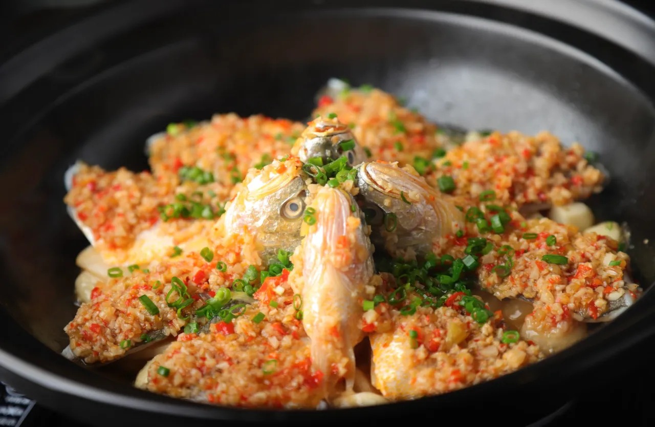 2. 取砂锅,放入炸好的大蒜瓣、姜片、杏鲍菇片铺好,肚腹朝上放入小黄鱼肉,再把每一片肉上抹匀自制酱椒,随卡式炉上桌。开火后均匀淋入用白兰地和啤酒调匀的汁水,焗10 分钟至熟,开盖后撒些葱花,即成。