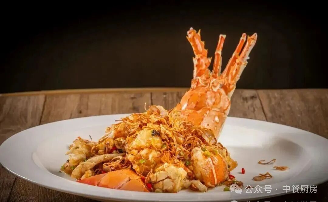 1.大青龙自然解冻后斩下头尾,虾身改刀成块,拍上薄薄一层干淀粉,入六成热油炸至断生、起脆捞出。红葱头切片,入热油炸至金黄,捞出备用。