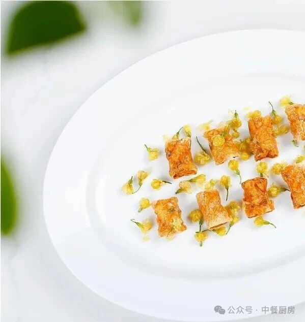 4、在盘内摆放好酥皮卷,每个酥皮卷内轻轻填入适量的煎好或烤好的松茸片,在松茸片上轻轻点缀上鱼子酱,并撒上少许香椿苗或其他装饰性蔬菜。将酥皮松茸配鱼子酱轻轻摆盘即可;