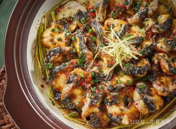 4、 腌拌好的白鳝均匀的摆放在香茅上,加盖中火焗10分钟,最后沿锅边淋上白兰地酒后点火,激发香味,揭盖撒上葱花即可