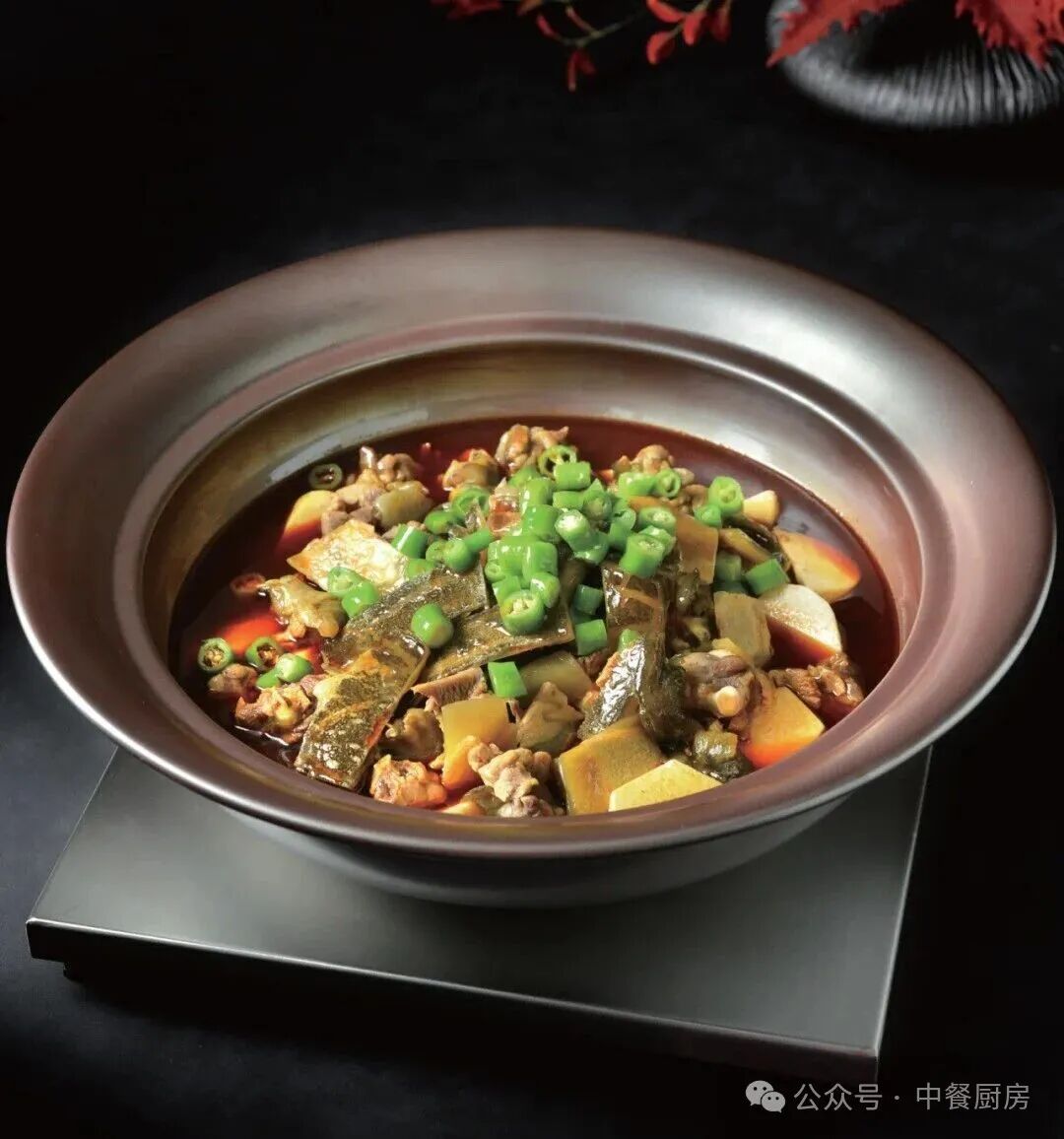5.拣出甲鱼块并留原汁,然后下入芋儿块烧至汤汁浓稠时,淋花椒油推匀;