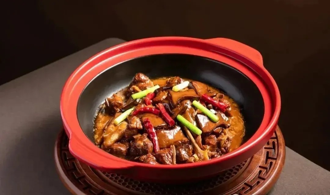 4、当客人点单后,取3个牛肝菌切片。入油炸至金黄色捞出备用。砂锅上火,盛入1/3份量的老鹅及适量原汤。放入炸好的牛肝菌片,共同烧2-3分钟。最后点缀拉过油的辣椒段和香葱段即可上桌。