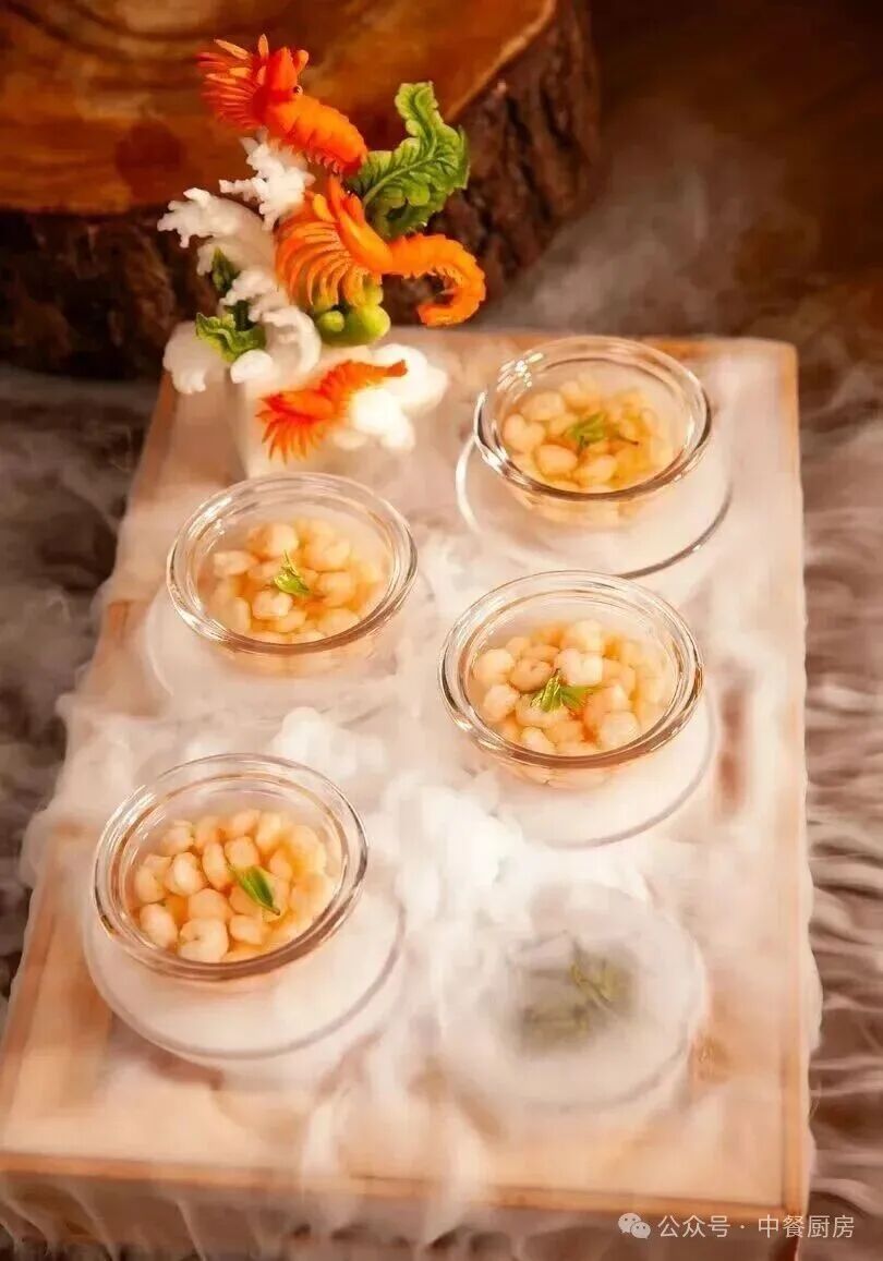 4、虾仁入锅烫9秒,捞出分至各客餐具内;将第二泡滤出保温备用的茶汤,冲入虾仁各客盅内出品。
