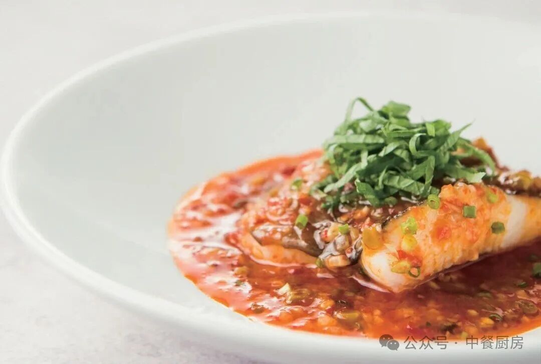 3.往锅里剩余汤汁中加入白糖、醋调味,勾入适量芡汁,淋在江团块上,最后撒上藿香丝和葱花,即成。