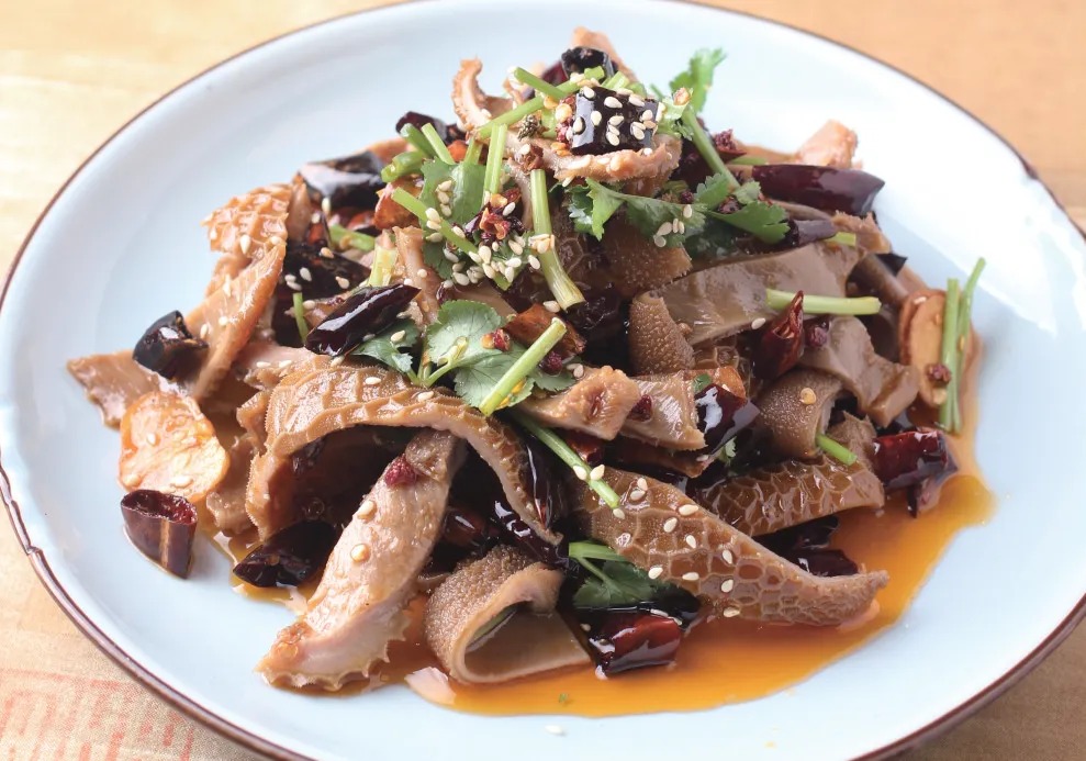 2.炒锅倒入菜油烧热,下入干辣椒节、花椒、蒜片炒香,倒入装有卤好羊肚块的盆里激香,调入盐、味精、鸡精、白糖、香油拌匀,装盘后撒些花生碎、熟芝麻、香菜,即成。
