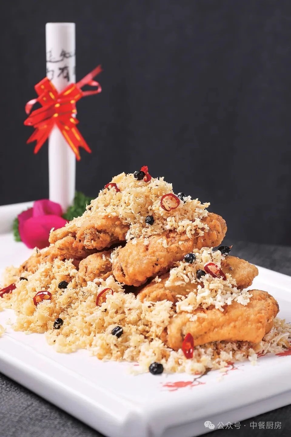 2.锅留底油,下入阳江豆豉、辣椒丝炒香,放入黄面包糠炒至酥香,下入炸好的鸡中翅,调入味椒盐炒匀入味,起锅装盘即成。