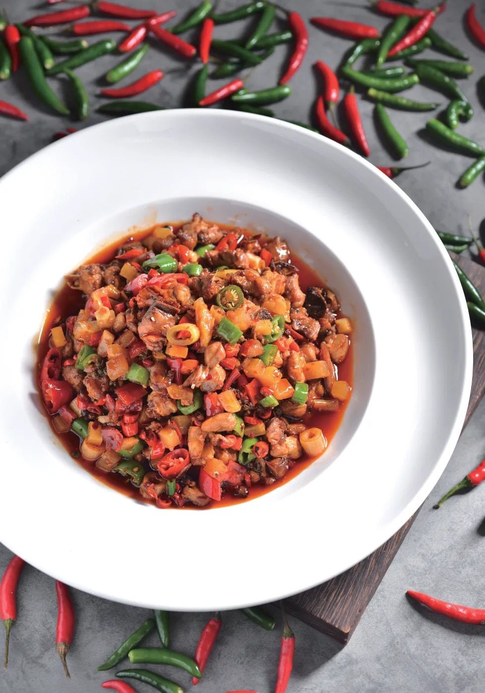 仔公鸡肉500克、泡小米椒100克、泡子姜100克、大蒜瓣50克、芹菜颗30克、荆条辣椒50克、红花椒5克、白糖5克、胡椒3克、味精5克、花椒油5毫升、香油5毫升、菜籽油适量