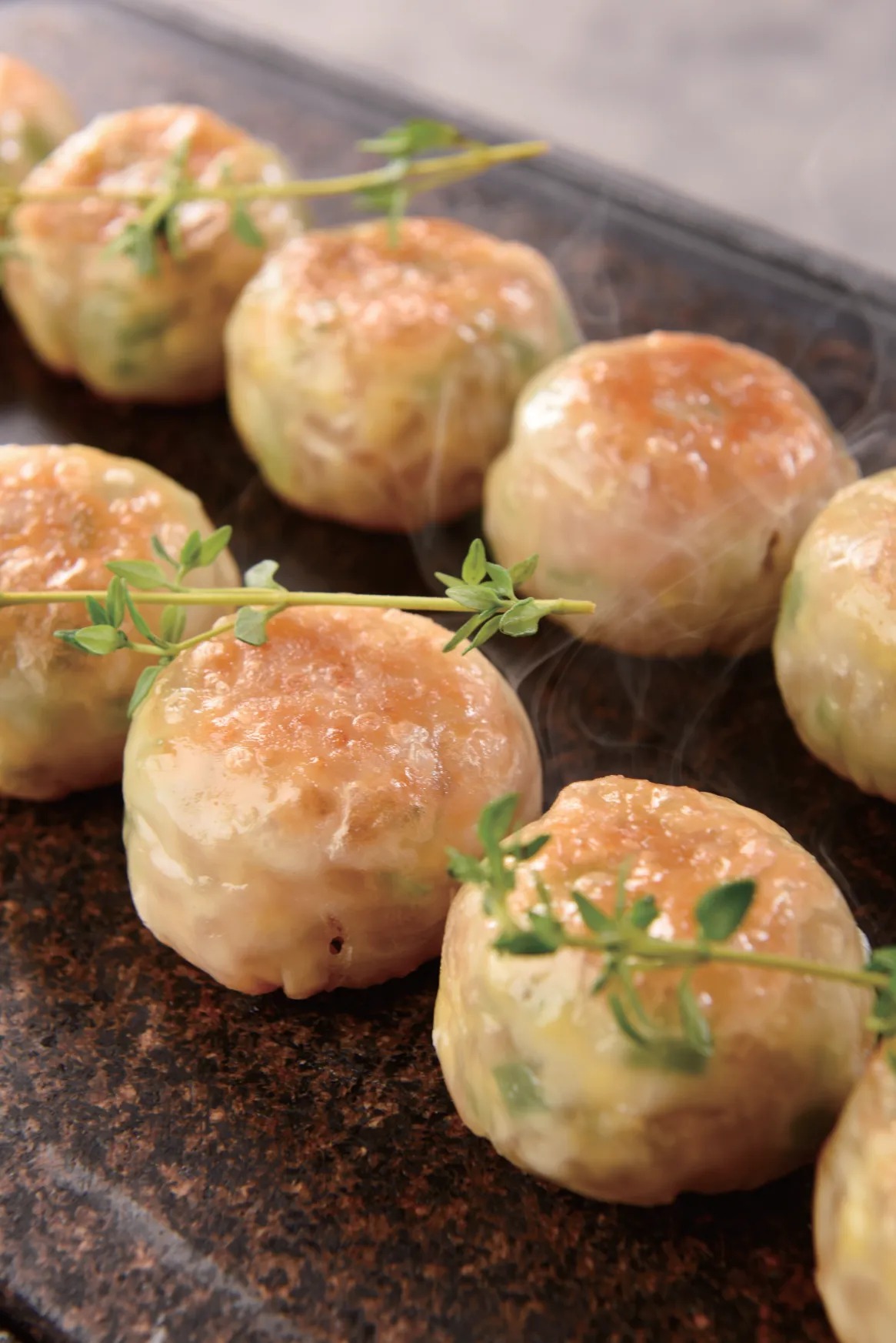 3. 将面团下剂,擀成如纸一般薄的皮,舀入适量馅料包好压扁,先上笼蒸约2分钟,取出来放入