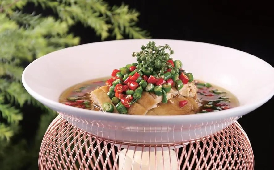 嫩土公鸡200克、洋葱丝150克、青小米椒粒30克、小米椒粒30克、鲜青花椒10克、藤椒油5毫升、花椒油5毫升、鲜鸡汤100毫升、姜片、葱节、花椒、黄栀子、芹菜、香菜、盐、料酒、东古一品鲜、辣鲜露、美极鲜、鸡精、味精、白糖各适量