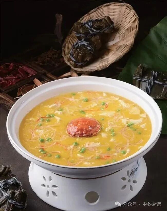 母大闸蟹1只(约175克)豆花400克金瓜汁20克蟹柳25克蜜豆20克鸡粉1克盐3克味精1克浓汤、生粉、鸡油各适量