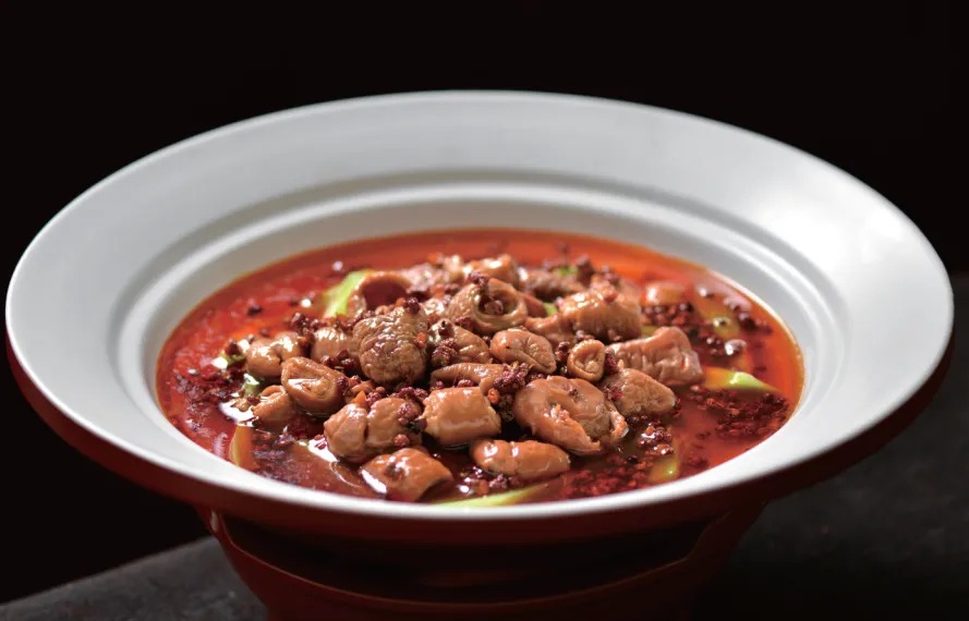 3.锅入熟菜油烧热,下入兔肉丁炒散且肉色发白后,放入自制火爆料、自制泡椒料、干青花椒、干红花椒、鲜青花椒、子姜丝、大葱颗、青小米椒、红小米椒炒香,加入调料汁,炒至原料熟,起锅装入大青花盘,撒入熟白芝麻即成。