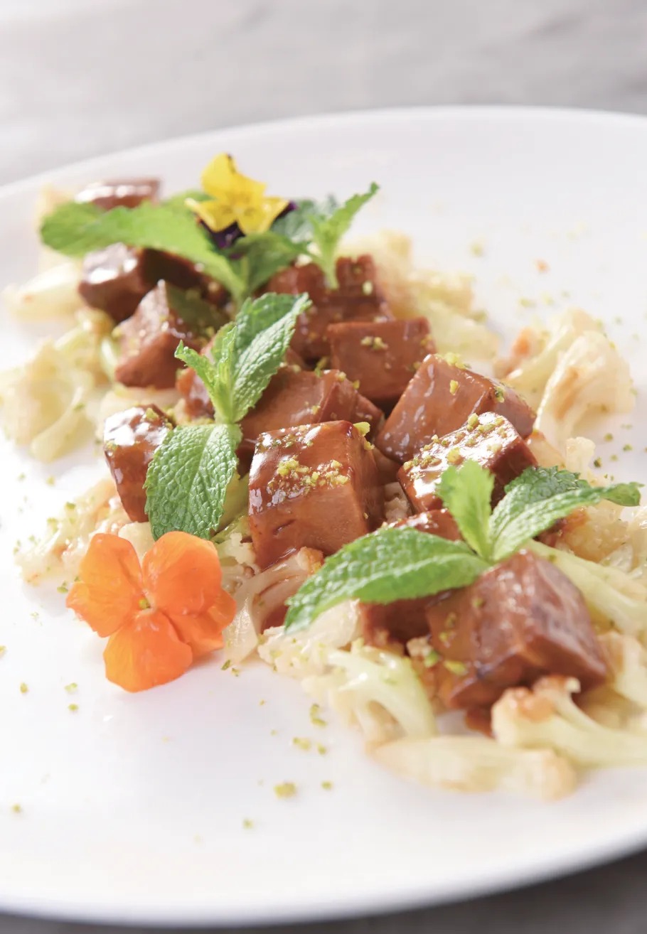 3.花菜下锅调好味,起锅置于盛器中垫底。净锅入猪油烧热,倒入调制好的鲍汁, 放入压好的牛舌块,小火慢煨至入味,然后用水淀粉勾芡,待芡汁均匀包裹在牛舌块上,起锅装入花菜垫底的盛器中,撒上青柠碎、薄荷叶等点缀即可。