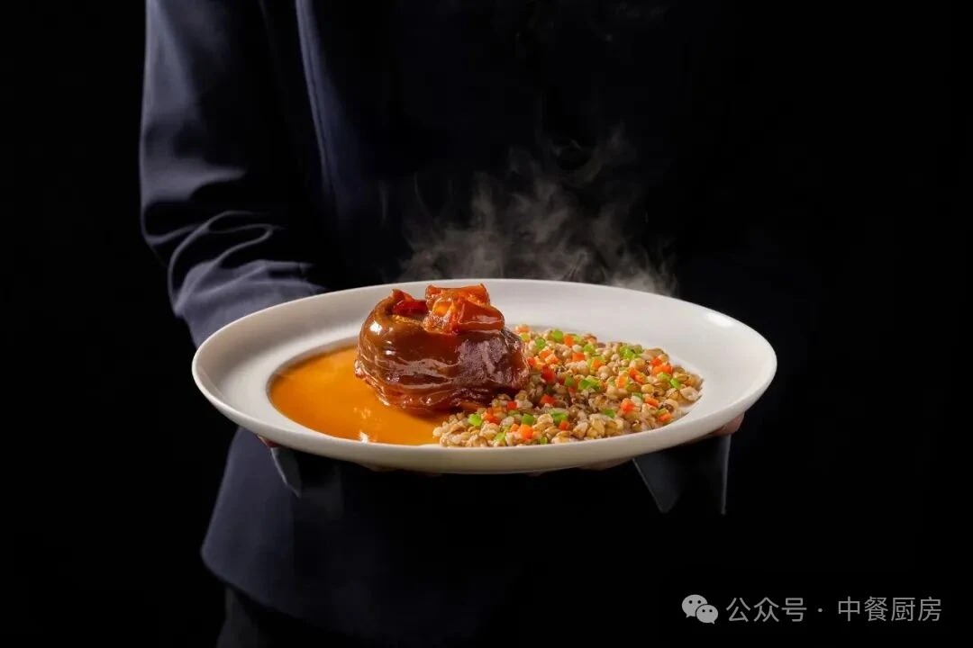 2、将处理好的牦牛掌放入熬制好的酱料红汤中,大火煨煮 30 分钟,再转小火慢煨 120 分钟,直至肉质粑糯入味。青稞淘洗干净,挑去杂质,用冷水泡发 3 小时后上锅蒸制,至颗粒 “笑口常开”;青红椒洗净,改刀成与青稞大小相近的正方粒。