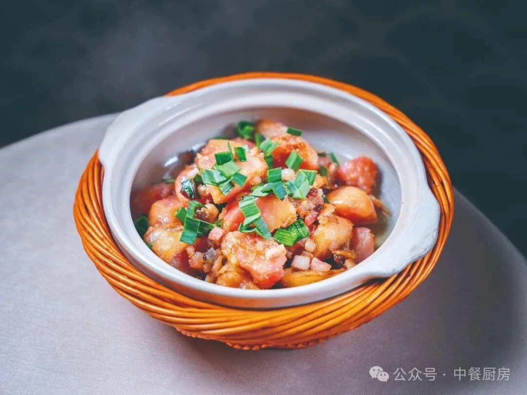 2.净锅入菜籽油烧热,下入火腿片爆香,放入炸好的土豆块,调入盐、胡椒粉、鸡精、味精炒匀入味,撒入蒜苗花炒香,出锅装入烤烫的煲仔内,即成。
