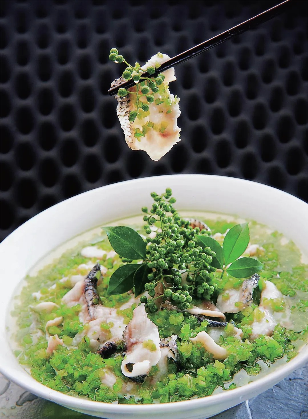 3.辅料炒熟后,入盆内打底。取适量腌制好的黑鱼片入锅内汆熟捞出,放在辅料上,再把自制青椒酱舀在鱼片上,撒上葱花和蒜泥、鲜青花椒,淋入六成热油炸香即可。