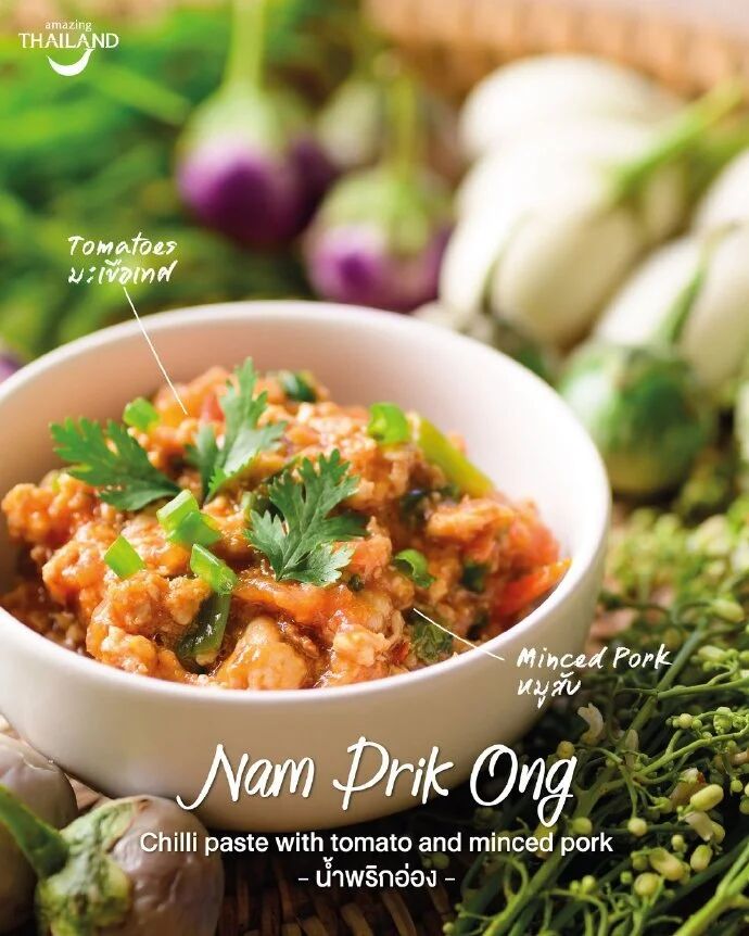 图五:【番茄肉酱Nam Prik Ong】番茄肉酱属于泰北一道非常有名的蘸酱,将泰国北部大番茄、青辣椒、红葱、大蒜放在炭炉上烤香后捣烂,加上鱼露和清柠汁调和而成,佐饭酸辣可口,十分开胃。
