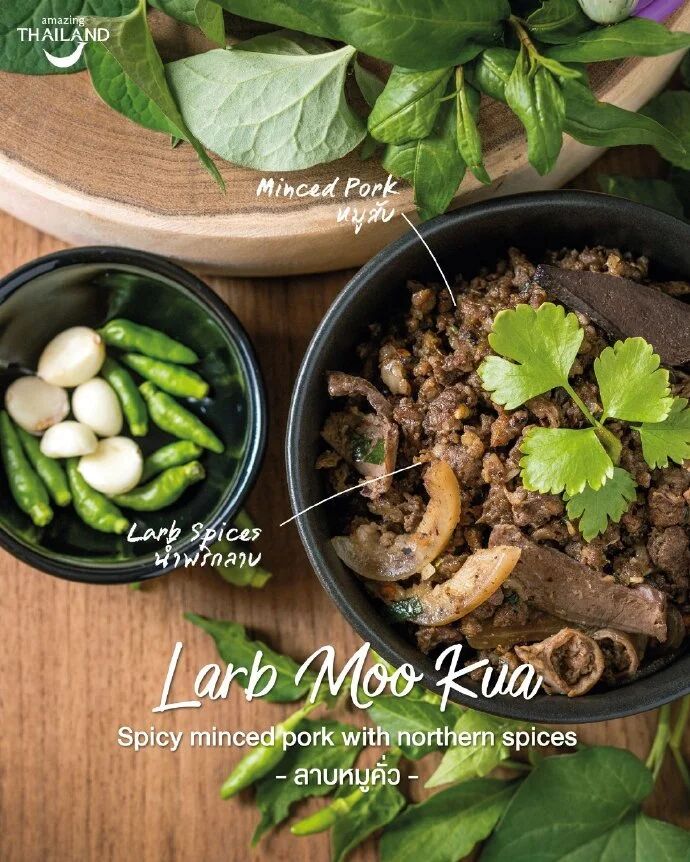 图二:【凉拌炒肉末Larb Moo Kua】泰语“Larb”指的是剁碎的肉末,通常可选猪肉或牛肉。泰北人家喜欢佐以辣椒、红葱头、鱼露、青柠汁、香茅等传统泰式调料,另外还会添加碎炒米以增加焦香的味道,十分下饭。