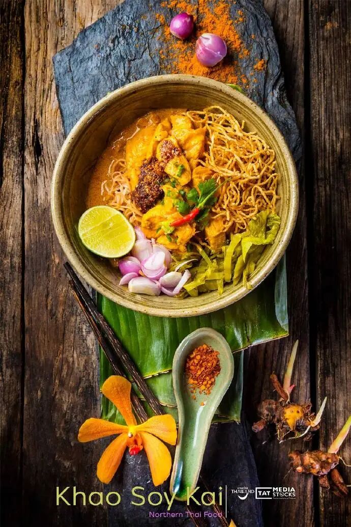 图九:【黄咖喱鸡肉面Khao Soi】无人不晓的泰北菜代表,清迈美食YYDS!浓郁的黄咖喱汤底配上大块鸡肉,再撒上一把炸得金黄的脆面,口感丰富而有层次,令人欲罢不能,不吃枉游清迈!