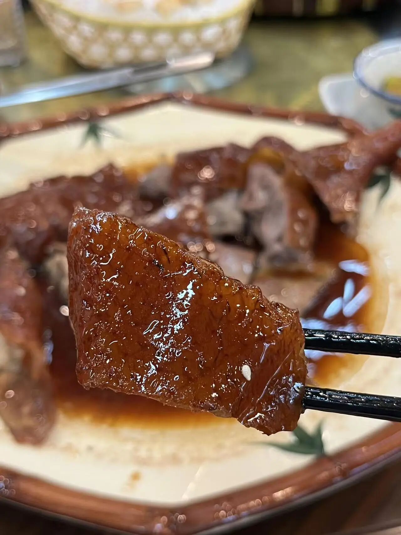 皮脆如玻璃,肉汁在口中爆开,配上酸梅酱解腻,舔手指。