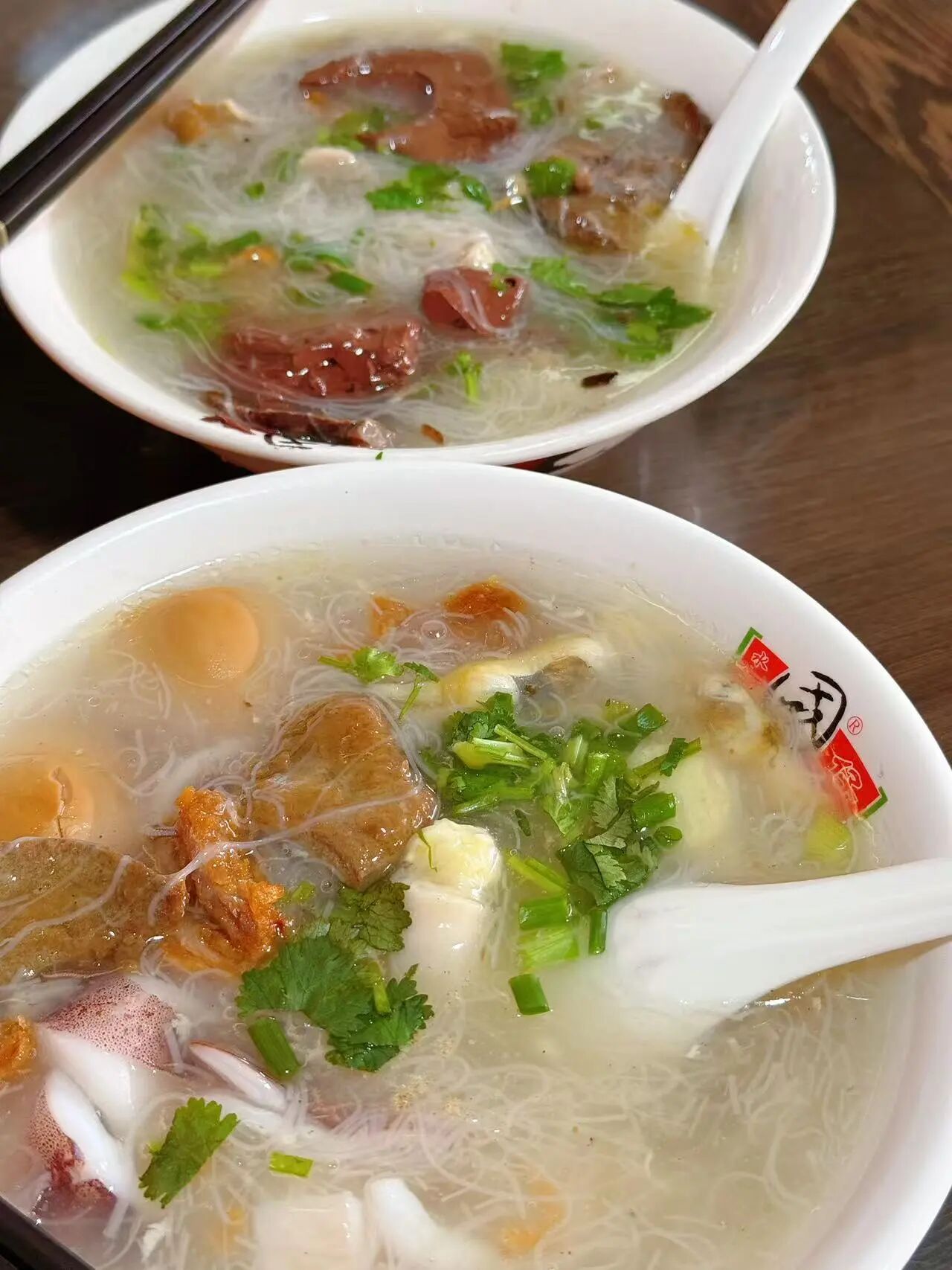 细如发丝的面条浸在海鲜骨汤中,加入油条、醋肉和大肠,稀里哗啦喝两碗。