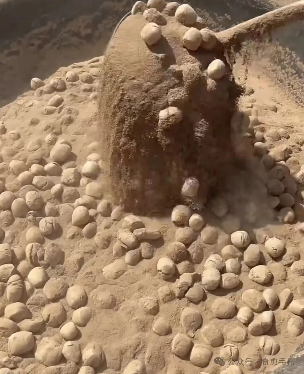它的主料确实是“土”!但人家用的是太行山上的一种白面土,俗称“观音土”。把面团搓成小指头大小的棋子,倒进烧得滚烫的土粉里,像炒栗子一样“噼里啪啦”爆炒。