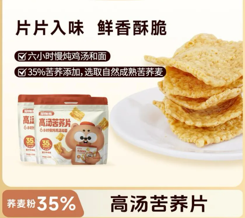 补充粗粮营养:含≥35%苦荞粉,苦荞本身富含膳食纤维、黄酮类物质,相比纯精粮膨化食品,能一定程度增加膳食纤维摄入,帮助维持肠道蠕动
