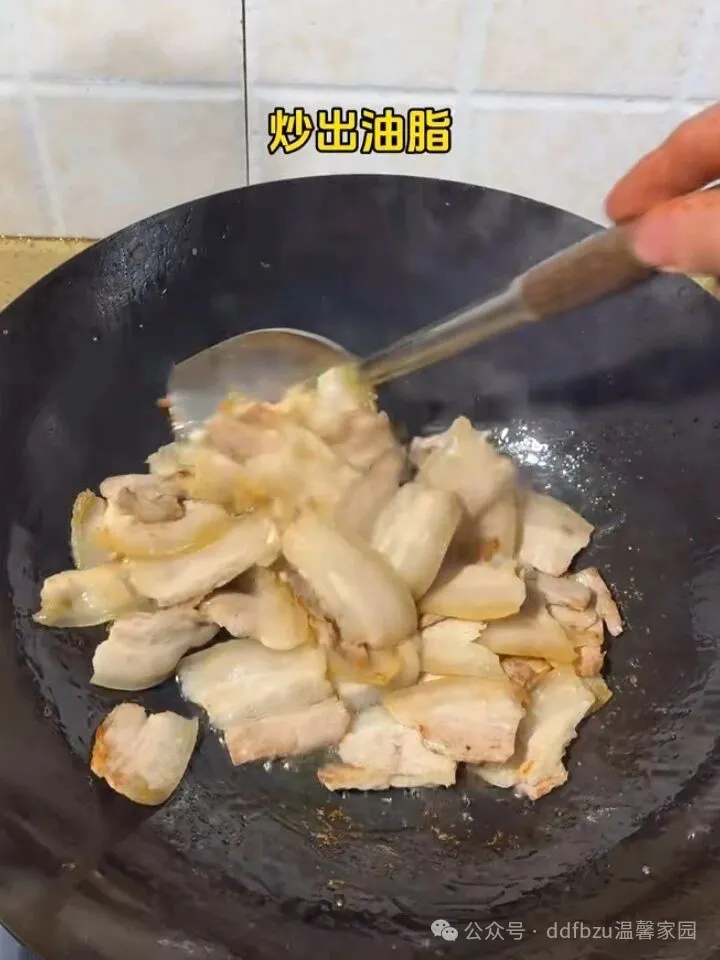 2. 处理五花肉:五花肉提前煮熟,切成薄片,锅中不放油,直接放入肉片,小火慢炒,炒出多余油脂,盛出备用(炒出油脂更不腻,口感更焦香);
