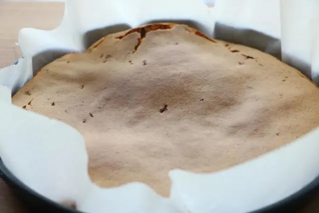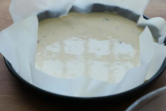 5、平盘铺上硅油纸,把拌好的面糊倒进去,轻震2下;