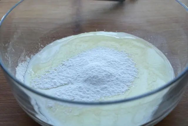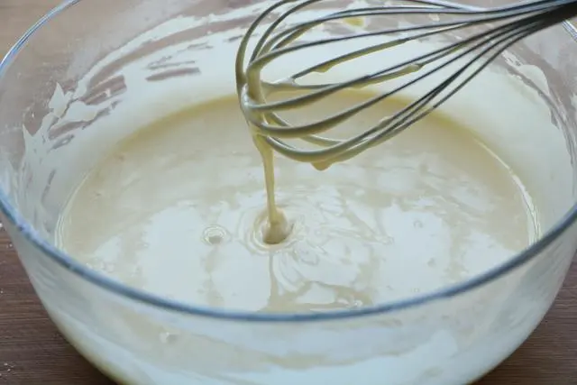 2、碗中加入1个鸡蛋、玉米油、牛奶,筛入糖粉,搅拌均匀;
