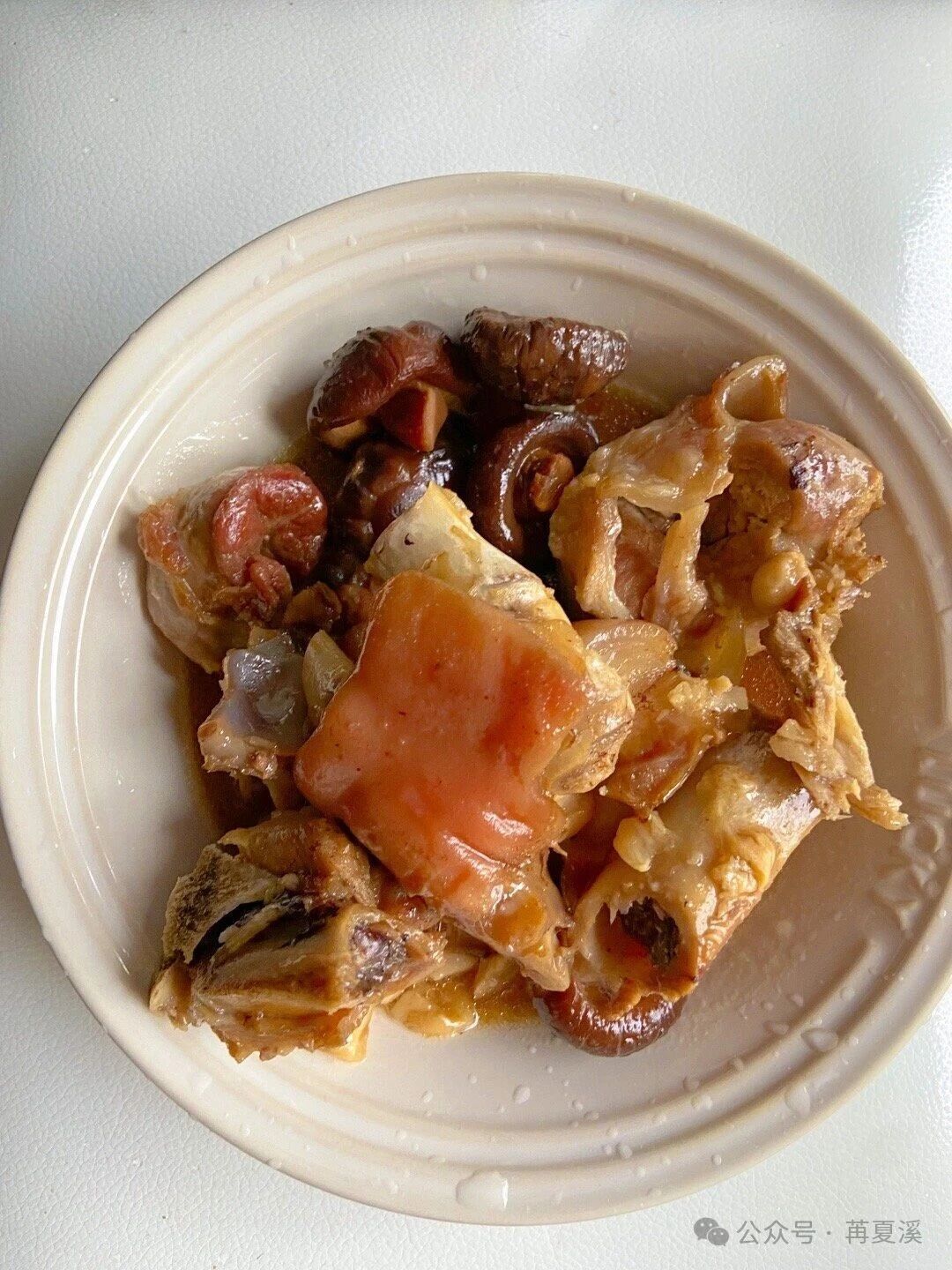 接着放香菇翻一翻,倒入刚才的香菇水,再加小半碗清水,没过猪脚一半就够。