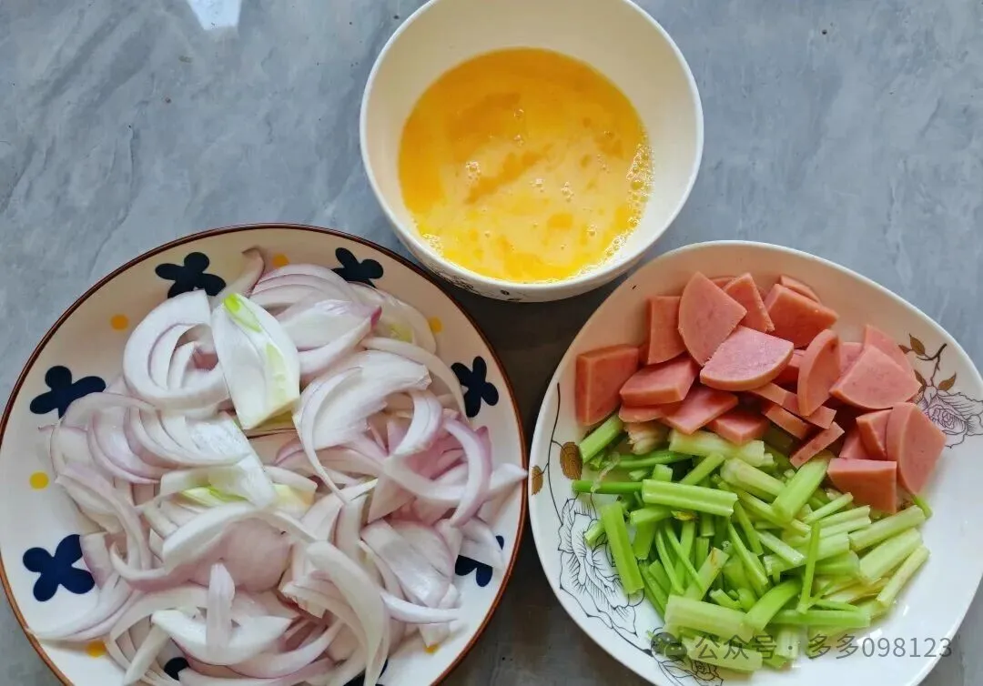 洋葱去皮切条 , 不用切太细 , 粗一点口感更好 , 芹菜切段 , 香肠切片 , 鸡蛋打散搅匀 , 葱蒜切末 , 就这么简单。