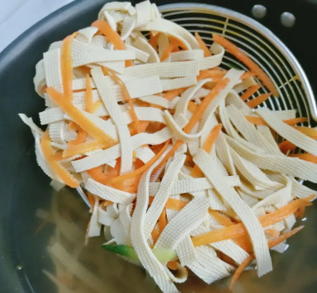 2、锅中烧水,把水烧开后,放入豆腐皮,再次烧开后,倒入胡萝卜,等开锅后,把豆腐皮和胡萝卜丝捞出,放到凉水中过凉;