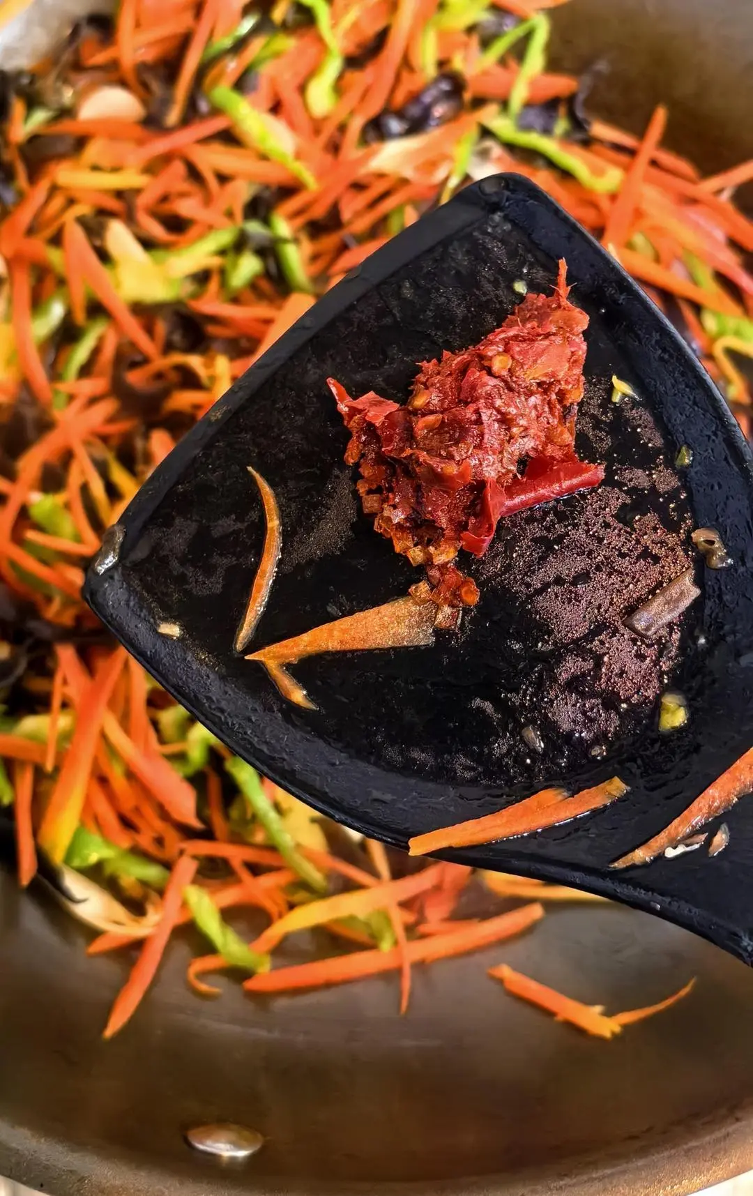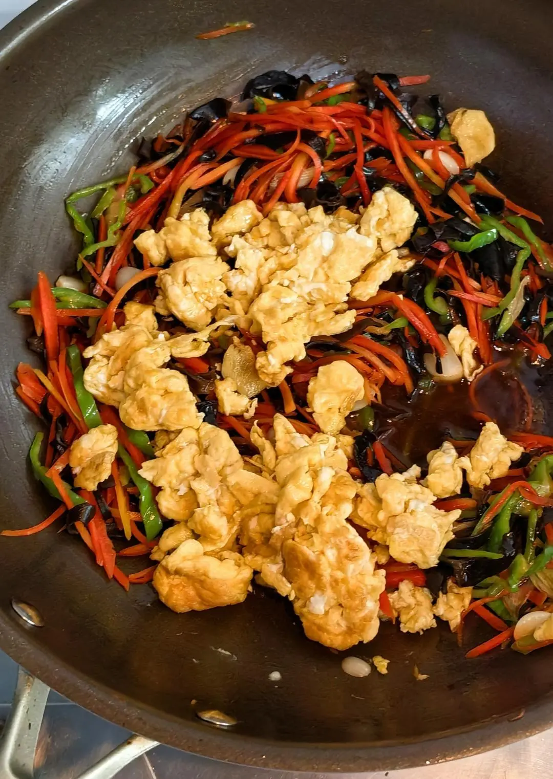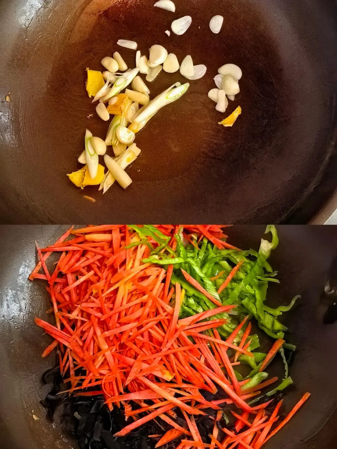 第四步☝️,鸡蛋捞起来,锅底煎鸡蛋的油留着,把大蒜,大葱片,老姜放进去爆5秒,然后把胡萝卜丝,木耳丝,青椒丝放进去炒30秒,