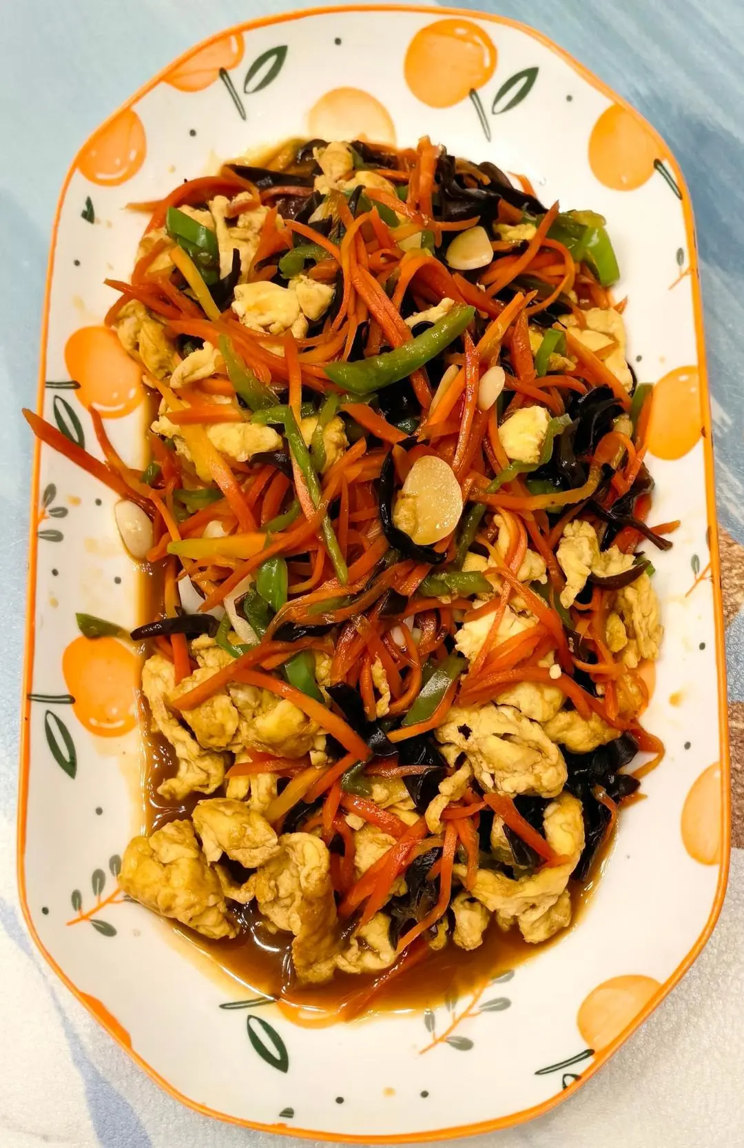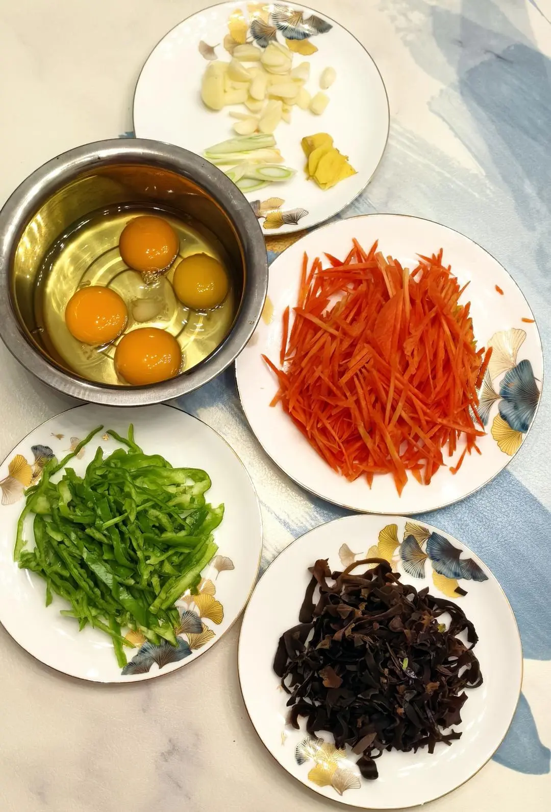 食材:鸡蛋4个,木耳100克,胡萝卜1根,大青椒2个,