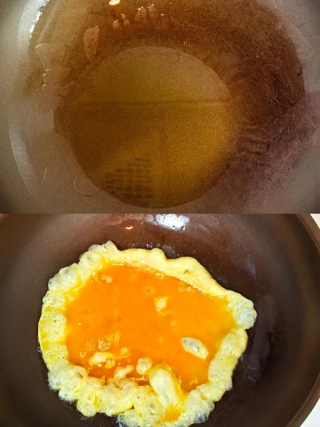 第三步☝️,锅里倒油烧热,把鸡蛋液倒进去小火煎,凝固60%就捣散,