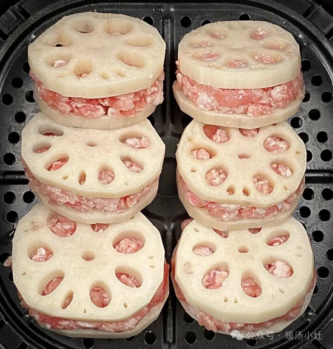 莲藕切薄片,中间夹上调好的肉馅,表面刷油。180℃烤15分钟,翻面刷酱再烤5分钟。外酥里嫩,少油更健康!