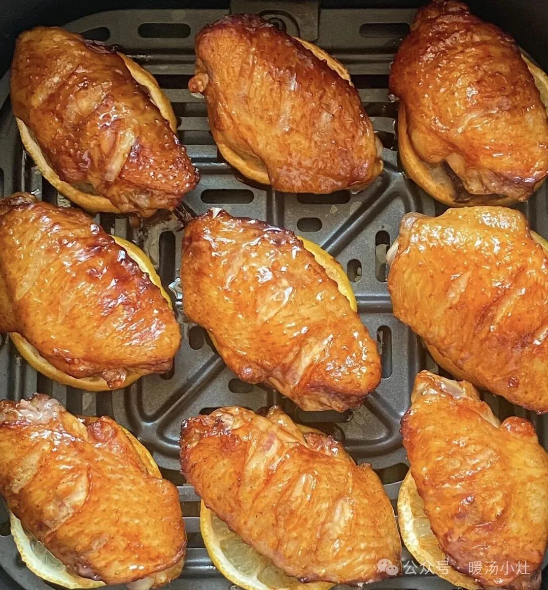 鸡翅用生抽、蚝油、蒜末、蜂蜜、柠檬汁腌制30分钟。放入炸锅,180℃烤15分钟,翻面再烤5分钟。柠檬的清香完美解腻,外皮焦香,内里多汁,好吃到舔手指!