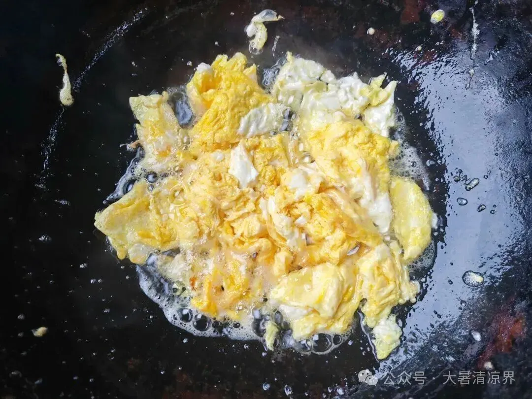 锅里倒油,烧热后倒鸡蛋液。别急着搅,等底部定型再用筷子划散。鸡蛋块炒大点,吃起来才过瘾。炒熟先盛出来,不然再回锅就老了。