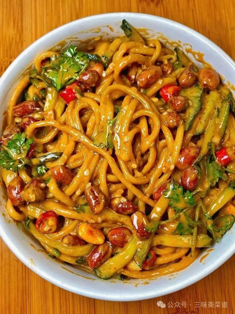 9.捞面、淋酱、 拌匀。