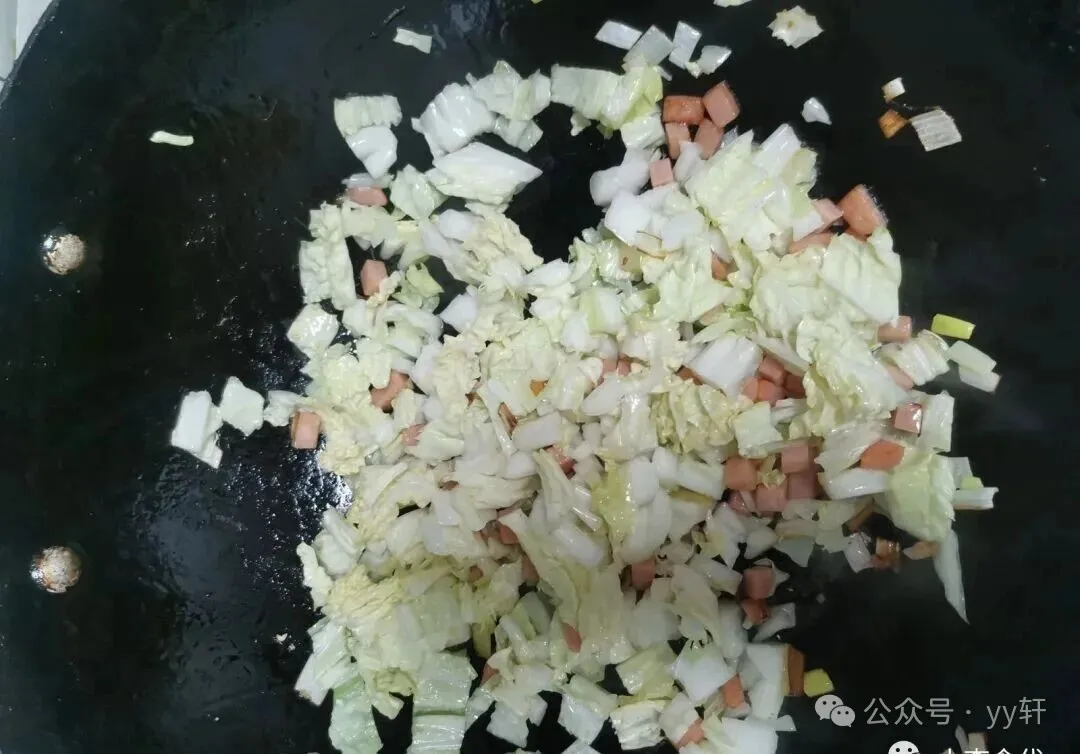 同一个锅 , 再加一丢丢油 , 葱花丢进去 , 嗞啦一声那个香味就出来了!然后火腿肠丁下锅 , 翻两下 , 再放白菜 , 白菜不用炒太久 , 断生就行 , 炒太软会出水 , 米饭就容易黏成坨了