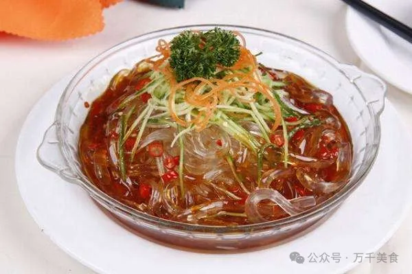 拌海凉粉是大连地区极具特色的传统美食,深受当地人和游客的喜爱。这道菜以海凉粉为主料,海凉粉是由海底的牛毛菜或石花菜等海藻类植物为原料,经过清洗、晒干、熬煮、过滤、晾凉等工序精制而成,其口感滑嫩爽口,晶莹剔透,宛如琼脂。制作拌海凉粉时,将切好的海凉粉与黄瓜丝、香菜、蒜泥、米醋、酱油、芝麻酱、香油等调料拌匀,即可食用。这道菜酸辣咸鲜,清凉解暑,特别适合夏季食用,是大连海鲜文化中的一道亮丽风景线。