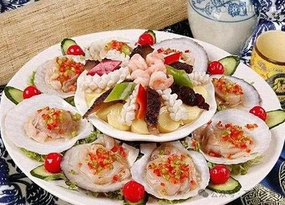 五彩雪花扇贝是辽宁省传统的特色名菜,属于东北菜系。由蛋清制作的像银白色的雪花镶嵌着颗颗犹如珍珠的扇贝,周围用时令菜叶、胡萝卜、辣椒等摆成图案做装饰,五彩缤纷,质嫩味鲜,清淡爽口,食而不腻。五彩雪花扇贝是大连乃至东北地区的传统特色名菜之一。这道菜以新鲜活扇贝和蛋清为主料,扇贝肉质鲜嫩,蛋清口感细腻,二者搭配在一起,再经过精细的烹饪技巧,使得蛋清如银白色的雪花般镶嵌在扇贝之上。周围再点缀以红椒、青豆、胡萝卜等色彩丰富的时令蔬菜,使得整道菜五彩缤纷,宛如一件精美的艺术品。品尝时,扇贝的鲜美与蛋清的细腻相互交融,口感层次丰富,清淡爽口而不腻,令人回味无穷。