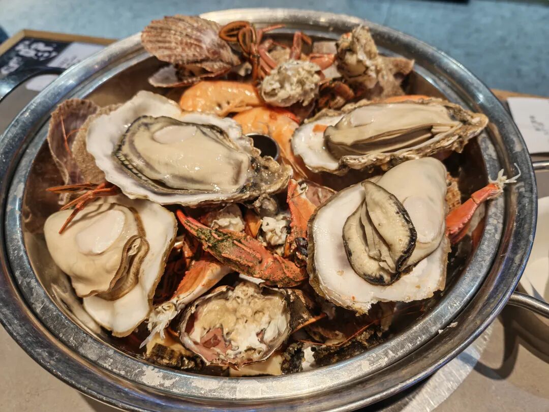 每个餐桌上都备有一个电磁炉,随吃随蒸。下图是已经蒸熟的海鲜锅。原汁原味的海鲜锅,带着海风的温柔与海浪的咸香,真的是锁鲜本味,非常有食欲。