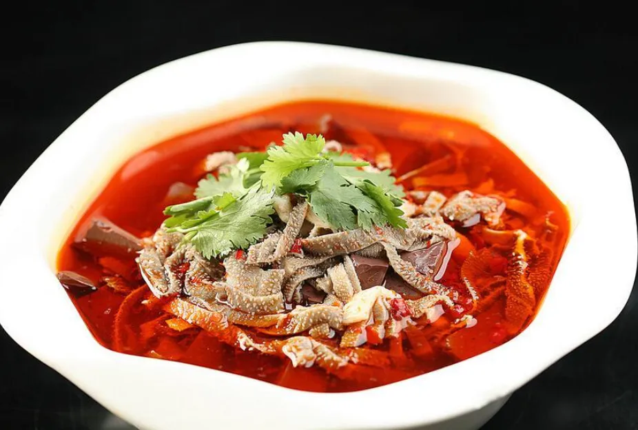 铜锅内,牛肉的暗红、牛肚的浅褐、牛血的嫩白在热汤中翻滚,辣椒的鲜红点缀其间,热气裹挟着麻辣鲜香直冲鼻腔。夹一筷牛肉,绵软中带着韧劲,汤汁的醇厚渗进每一丝肌理;嚼一口牛肚,爽脆弹牙,辣意与鲜味在齿间碰撞;舀一勺牛血,滑嫩得近乎入口即化,酸辣的滋味瞬间唤醒味蕾。这道新化人引以为傲的汤品,原是梅山先民对抗湿寒的智慧—— 用铜锅作器,以牛之三味为料,在热辣中煮出湘西的豪迈。
