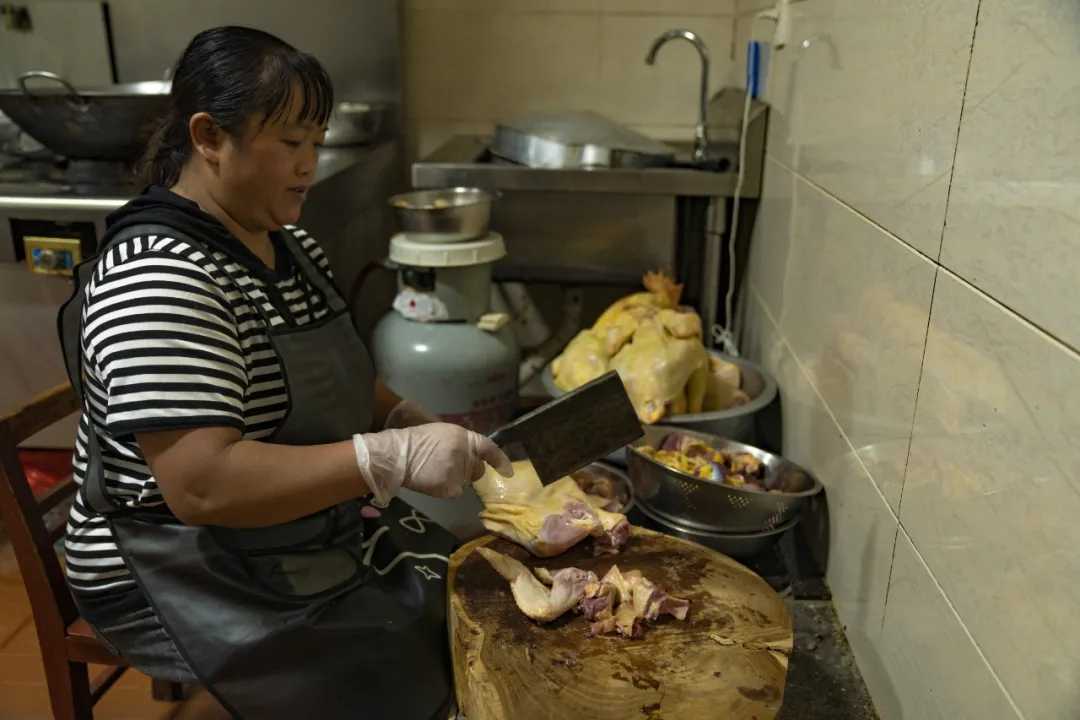 对食客而言,真正的精髓在于“哈”豆腐的过程——将新鲜豆腐捣成不规则碎块再加到做好的辣子鸡中一同煨至入味。在此过程中,先吃鸡、后吃豆腐,在热气的蒸腾中豆腐逐渐入味,食客本身也参与到了烹饪过程中,参与感十足。对外乡人而言,“鸡哈豆腐”独特的名字带来了不同寻常的风格。燕楼镇马家和鸡哈豆腐的传承人小马厨师告诉我们,制作的火候要把握精准,味道要拿捏到位,但是调味要尽可能简单,仅有生姜、蒜粒、酱油、精盐四种,这样才能保持公鸡本身的鲜香,吃出地道的农家味。
